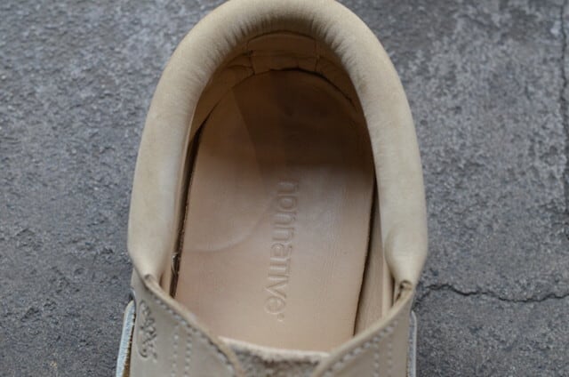 職人による手縫いの製法はそのままに、アッパーを〈nonnative〉らしいTAUPEカラーに統一。やや毛足の長いスウェードをベースに、ヌバック素材で切り替えることで、素材のニュアンスによるコントラストが生まれ、都会的でスタイリッシュな印象にアップデート。